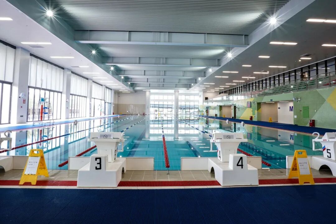 北师港浸大体育馆共有4层,负一层为1400㎡的健身区,划分四大训练模块,配备360XL多功能训练器等尖端设备;一层为恒温泳池,50米赛道划分三区,联动健康实验室打造科学训练体系;二层是可容纳15张球台的乒乓球室及医师驻场康复室,形成运动损伤预防闭环;三层为2200㎡的多功能馆,可灵活转换三大球场地,并能满足千人活动的需求;顶层是剑道室、柔道室及教室,拓展格斗艺术与通识维度。北师港浸大体育馆将体育设施升华为全人教育载体,重塑大学体育的育人范式。