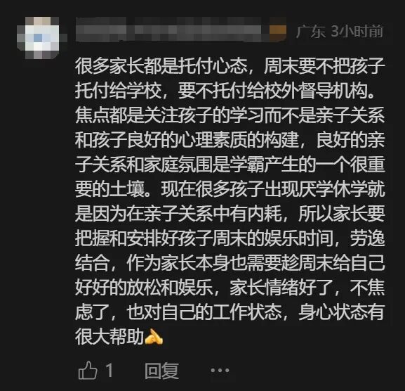 还有网友提到,除了孩子,家长心态也很重要。“家长要把握和安排好孩子周末的娱乐时间,劳逸结合,作为家长本身也需要趁周末给自己好好地放松和娱乐。”