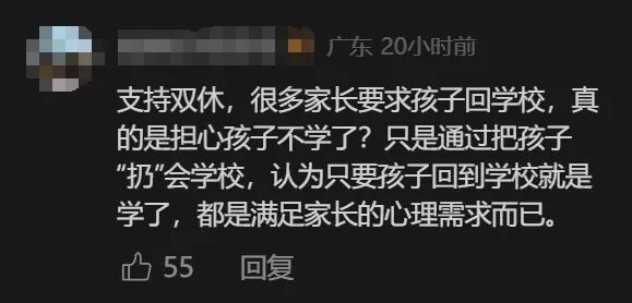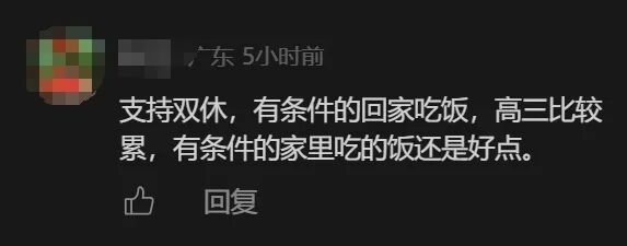 有赞同落实双休的网友表示,有些家长要求孩子回学校,实际上是逃避责任的行为,有网友认为,高三学生比较累,有条件的应该回家里好好休息。