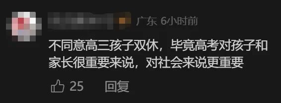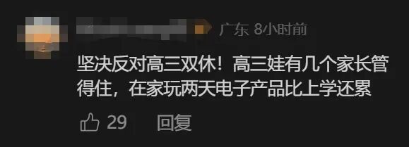 有网友称,高考对于孩子和家长来说很重要,因此不同意高三孩子双休,还有网友直言“高三娃管不住”!