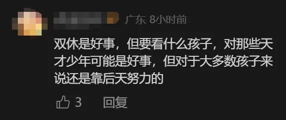 同时,也有网友表示,大多数孩子无法控制手机;双休是好事,但要看什么孩子,除此之外,是否落实双休,也需要同步考虑与其他地区学生的竞争。