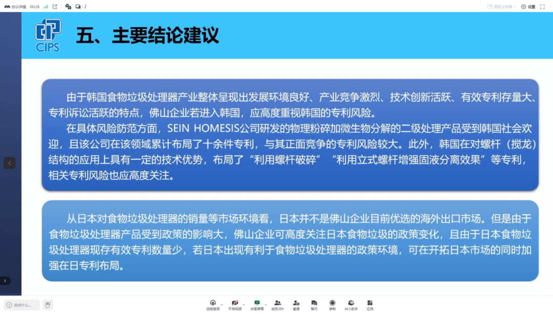 5月13日下午,佛山市知识产权保护中心(海外知识产权纠纷应对指导佛山分中心,以下简称“佛山保护中心”)成功举办“海外知产识多D” 第二十二期——企业海外专利侵权风险防控线上培训暨《食物垃圾处理器海外专利预警报告》(以下简称“《报告》”)发布会,中国知识产权研究会咨询业务主管周俊对《报告》进行正式发布。