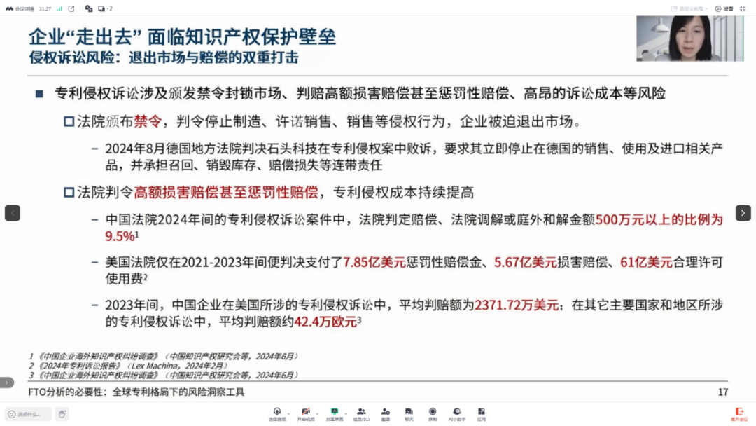 本次活动还邀请了北京市汉坤律师事务所合伙人张健,分享企业开展自由实施分析报告(FTO)的策略和实操要点。FTO是企业产品出海的前置程序,用于排查目标市场的专利壁垒,是企业规避侵权风险、制定规避方案、降低布局成本的重要途径。张健以智能家电领域为例,通过具体案例为企业如何开展FTO提供清晰的思路与方法。