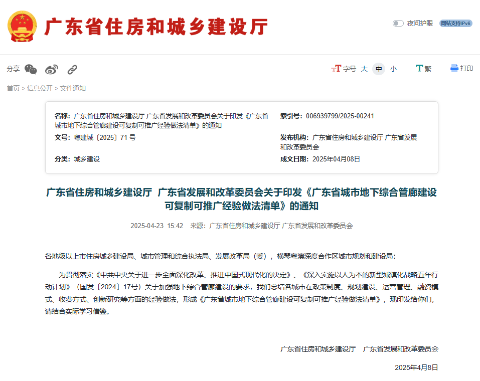 为贯彻落实关于加强地下综合管廊建设的要求,近日,广东省住房和城乡建设厅、广东省发展和改革委员会印发《广东省城市地下综合管廊建设可复制可推广经验做法清单》,展示了关于城市地下综合管廊建设方面的广东经验。
