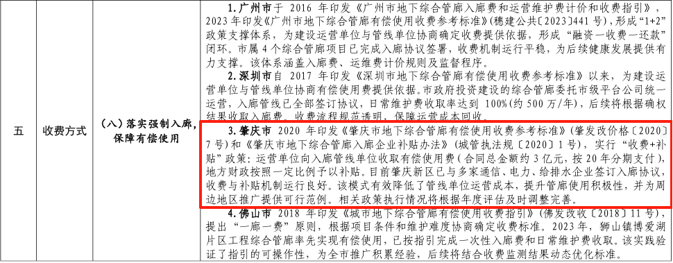 肇庆市2020年印发《肇庆市地下综合管廊有偿使用收费参考标准》(肇发改价格〔2020〕7号)和《肇庆市地下综合管廊入廊企业补贴办法》(城管执法规〔2020〕1号),实行“收费+补贴”政策:运营单位向入廊管线单位收取有偿使用费,地方财政按照一定比例予以补贴。