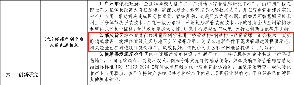 肇庆新区城市地下综合管廊在跨河涌段创新采用“桥梁结构+钢结构+穿涌管廊”组合技术,实现跨越式敷设,缓解多管线交叉与地下空间紧张矛盾,为复杂地形条件下缆线管廊建设提供示范。相关经验已在周边项目复制推广,成效良好,该做法为山区和水网地区提供了可行路径。