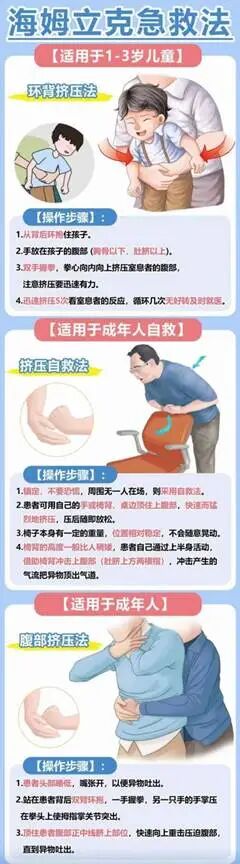 海姆立克急救法(Heimlich Maneuver)是一种在紧急情况下拯救因气道异物阻塞导致窒息患者的有效急救技术。下图是海姆立克急救法的详细信息,包括操作步骤、适用人群、注意事项等。