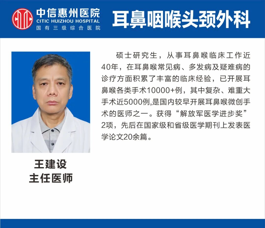 耳鼻咽喉-头颈外科是中信惠州医院重点学科。现拥有医护人员17名,主任医师1名、副主任医师2名、主治医师2名、管床医师3名,护士8名,开放床位20张。拥有日本奥林帕斯电子喉镜、德国WOLF鼻窦内窥镜系统(包括耳、鼻、咽喉食管及气管内窥镜检查及手术系统)、耳科与鼻科高速微型手术电钻、德国蔡氏耳科显微镜、美国杰克西等离子微创手术操作系统和床垫式睡眠呼吸监测仪、丹麦纯音测听仪、中耳分析仪、听觉诱发电位、耳鼻咽喉多功能综合诊疗台、过敏原检测系统等先进设备。