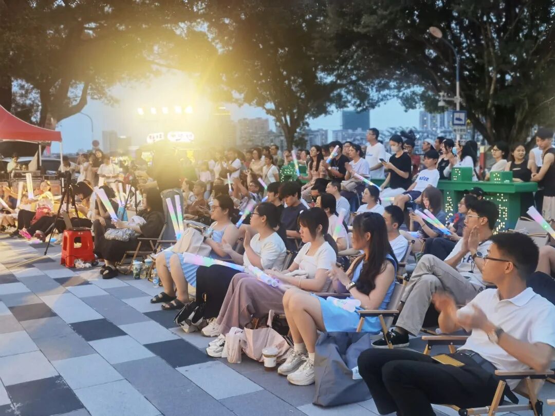 舞台前方,星湖波光粼粼。远处,七星岩轮廓隐约可见,与璀璨灯光交相辉映,营造出浪漫氛围。来自第十八届 “挑战杯” 省赛的参赛师生代表、肇庆本地高校青年歌手和学生齐聚一堂,共同为市民呈上一场 “夏夜限定浪漫”。