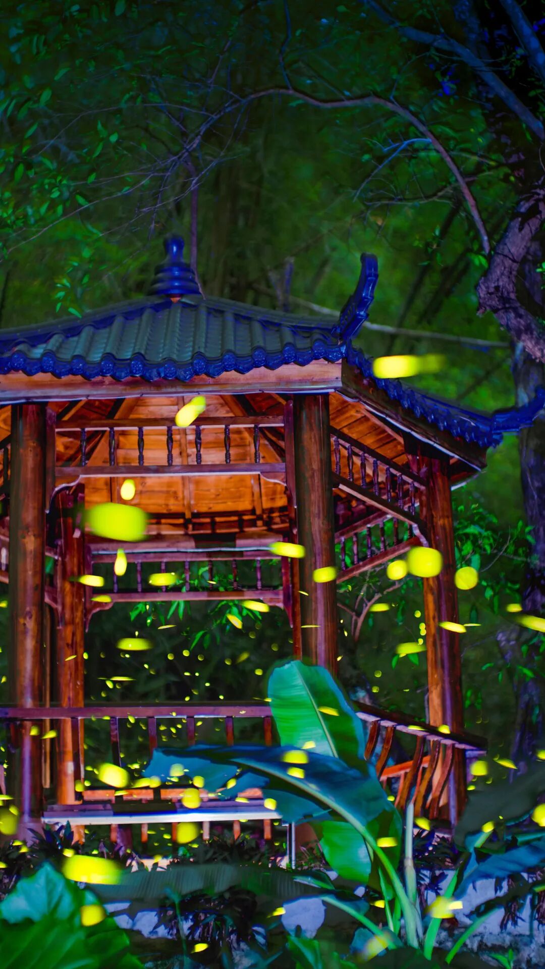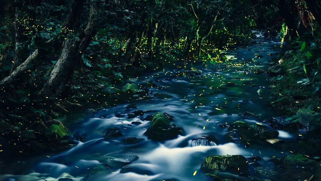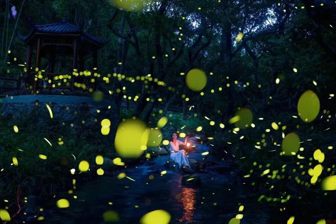 萤火虫像一群精灵在林间隐秘嬉戏,
