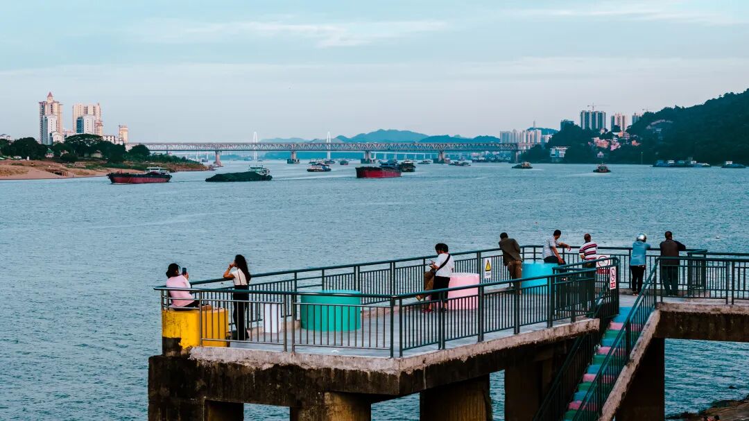 彩色步梯与江景构成绝佳背景。
