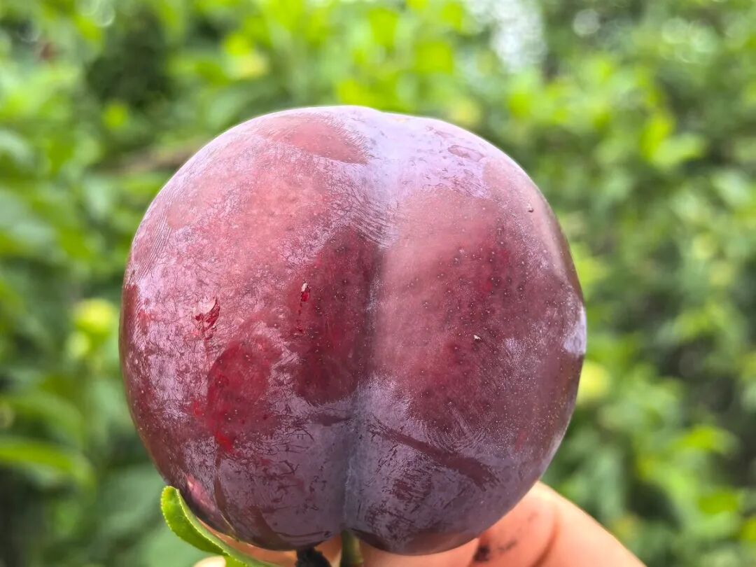 踏入徐记果园,郁郁葱葱的李子树映入眼帘。枝头上,颗颗饱满的台湾红李簇拥在一起,青的、红的、熟透的呈现出玫紫色,表面还覆盖着一层薄薄的白色果霜,在阳光下闪烁着诱人的光泽。不少李树因果实累累,树枝都被压弯了腰,仿佛在诉说着丰收的喜悦。