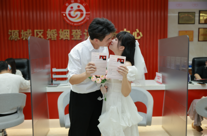 “为迎接‘5·20’登记高峰,我们提早准备,除开放预约通道外,还现场发放排队号,安排志愿者维持秩序,精心布置场地营造喜庆氛围,并联合多部门开展婚前健康检查等服务。”源城区民政局婚姻登记服务中心主任赖丽莉介绍,该服务中心有102对新人完成登记,其中全国通办异地办理占47%。她还说,随着新修订的《婚姻登记条例》落地实施,领证流程大幅优化,所需材料精简,登记效率显著提升。