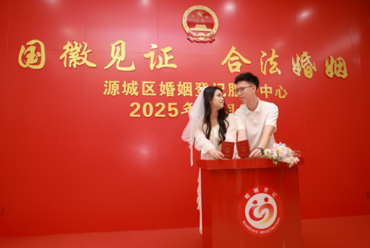 新修订的《婚姻登记条例》自5月10日起施行,婚姻登记实现“全国通办”且不需要户口簿,让这个“5·20”更加意义非凡。当日上午8时许,源城区民政局婚姻登记服务中心大厅座无虚席。为满足新人们的迫切期待,工作人员提前“开工”,在高效有序的流程下,短短几分钟,一本本红艳艳、承载着爱情与承诺的结婚证,便递到了新人手中。谈及领证心情,新人邓明珠说,因“2025520”谐音“爱你爱我,我爱你”,所以特意选在当天登记结婚。
