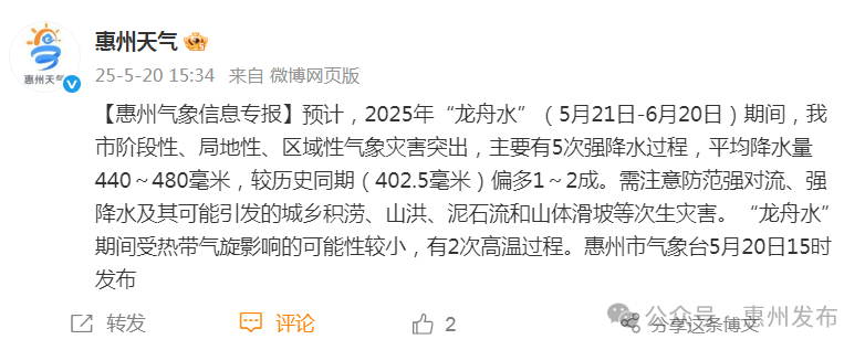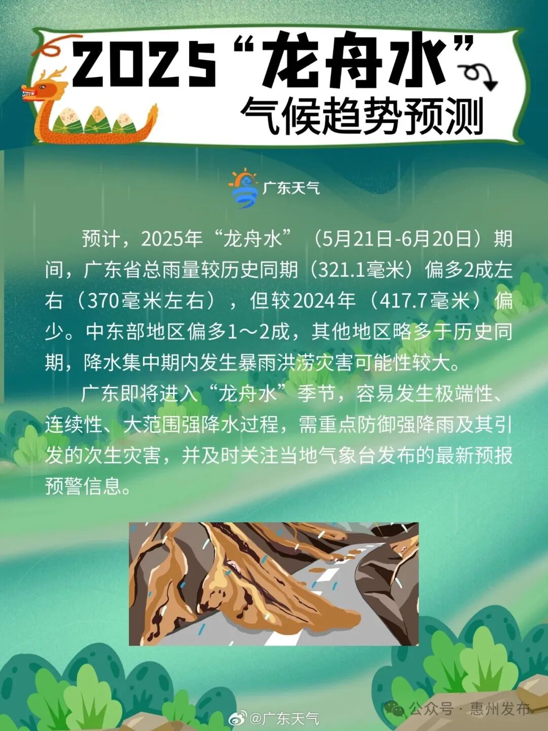 据广东气象部门预测,2025年“龙舟水”(5月21日至6月20日)期间,广东省阶段性、局地性、区域性气象灾害突出,广东省总雨量较历史同期(321.1毫米)偏多两成左右,但较2024年(417.7毫米)偏少。“龙舟水”期间有5次区域性暴雨过程,可能伴随有冰雹、雷雨大风和短时强降水等强对流天气。