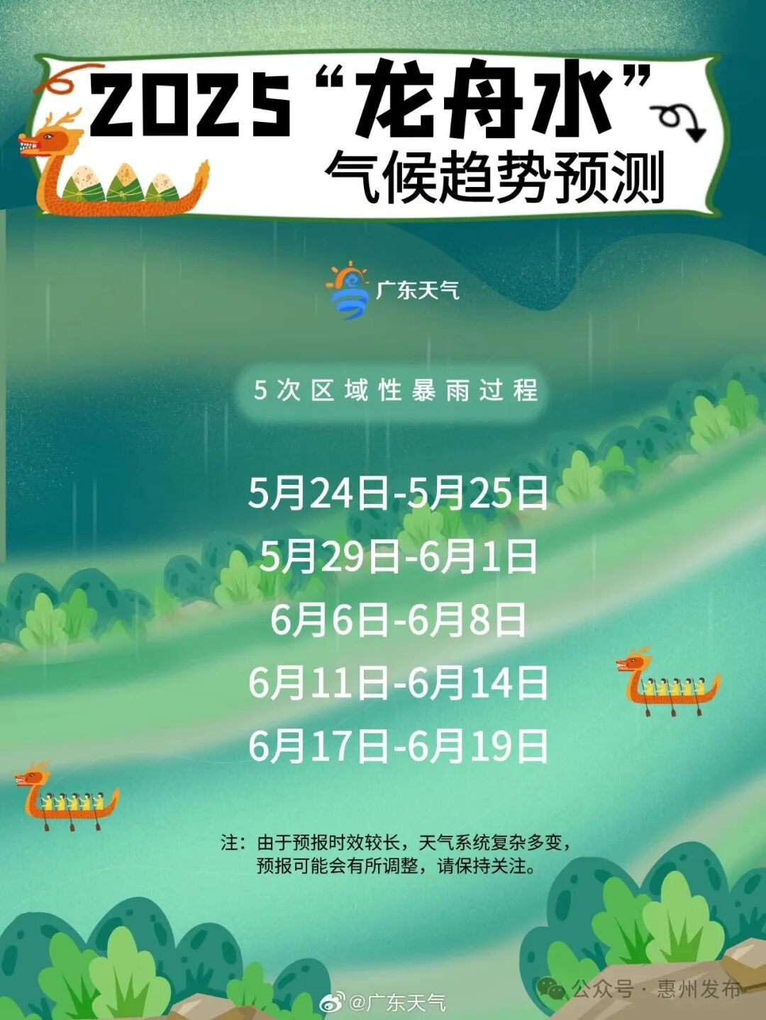 5次区域性暴雨过程为:5月24日至25日、5月29日至6月1日、6月6日至8日、6月11日至14日、6月17日至19日,降水集中期内发生暴雨洪涝灾害可能性较大。“龙舟水”期间受热带气旋影响的可能性较小,有2次高温过程(6月9日至10日、6月19日至20日)。