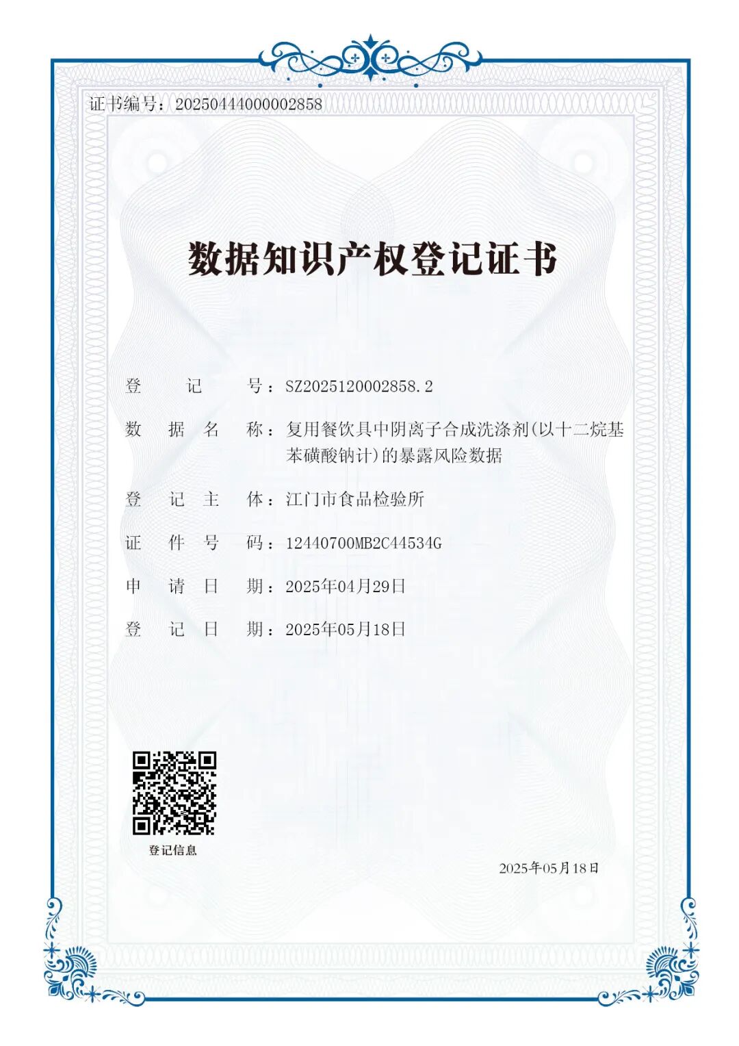 5月18日,在江门市知识产权快速维权中心辅导下,江门市食品检验所申请登记的“复用餐饮具中阴离子合成洗涤剂(以十二烷基苯磺酸钠计)的暴露风险数据”成功获得数据知识产权登记证书。该项登记为全市首例食品安全风险类数据知识产权登记,标志着江门市在食品安全领域的数据知识产权保护与运用方面迈出了坚实的一步,为全市食品安全监管工作注入了新的活力。