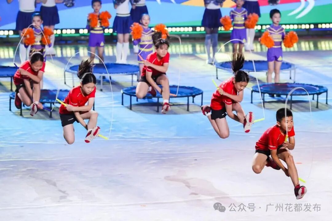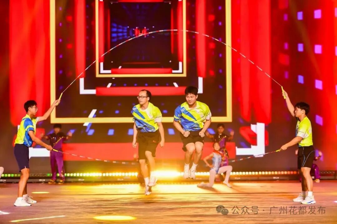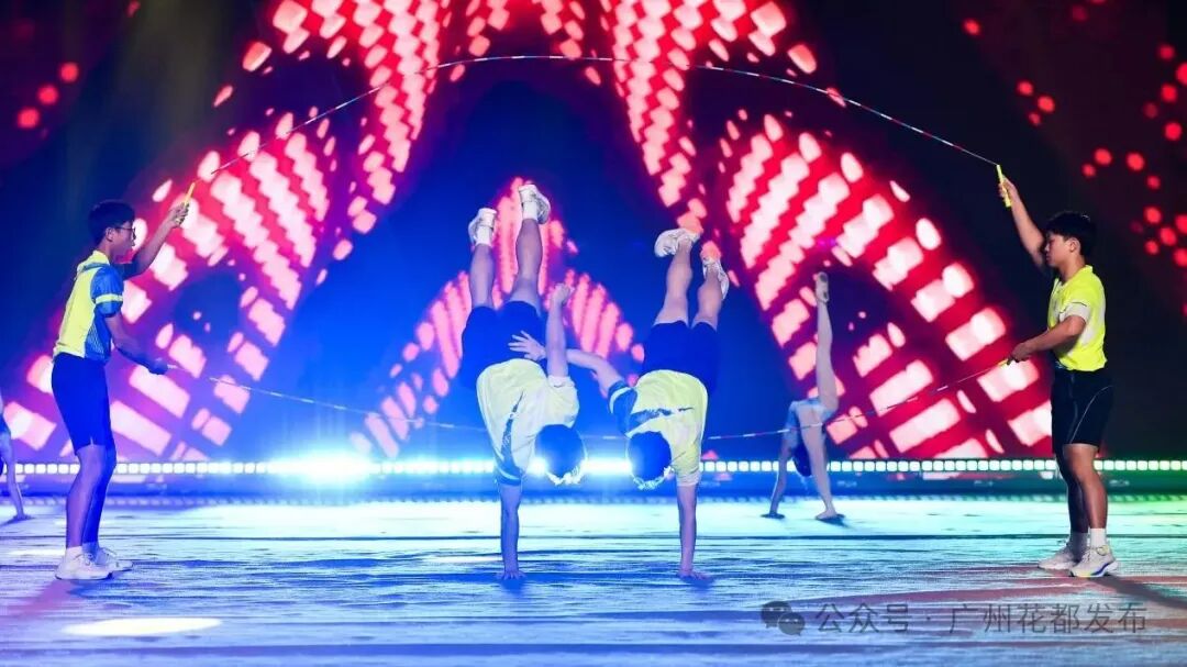 以花都跳绳运动员为主力的广州体育职业技术学院花样跳绳队也带来了精彩表演,世界吉尼斯纪录保持者、跳绳世界冠军岑小林、张崇杨、谢凯宇、陈嘉伟、江嘉煜、茹咏欣以及全国冠军沈嘉、曹纹静,他们将跳绳与体操、武术运动元素碰撞交融,带来别出新意的演出,以蓬勃朝气、拼搏之姿将现场气氛推向高潮。