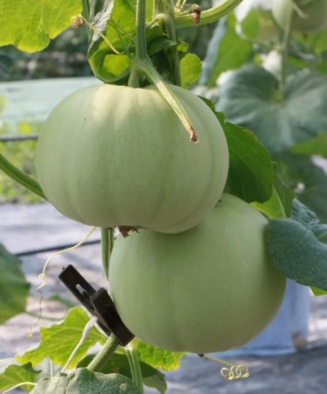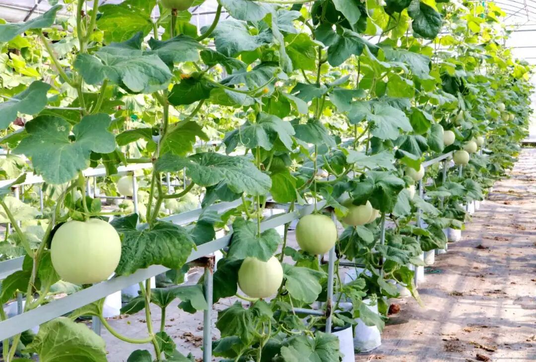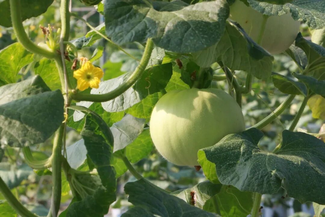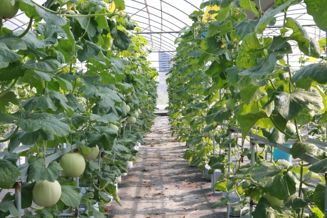 除了西瓜,农场大棚里的甜瓜也陆续成熟。棚内,清甜的果香扑面而来。嫩绿的瓜叶层层叠叠,瓜藤葱茏茂盛,色白如玉的甜瓜沿着搭好的架子被吊起,沉甸甸地挂在枝头,掩映在藤叶之间,青白相间、油亮饱满,香甜诱人。