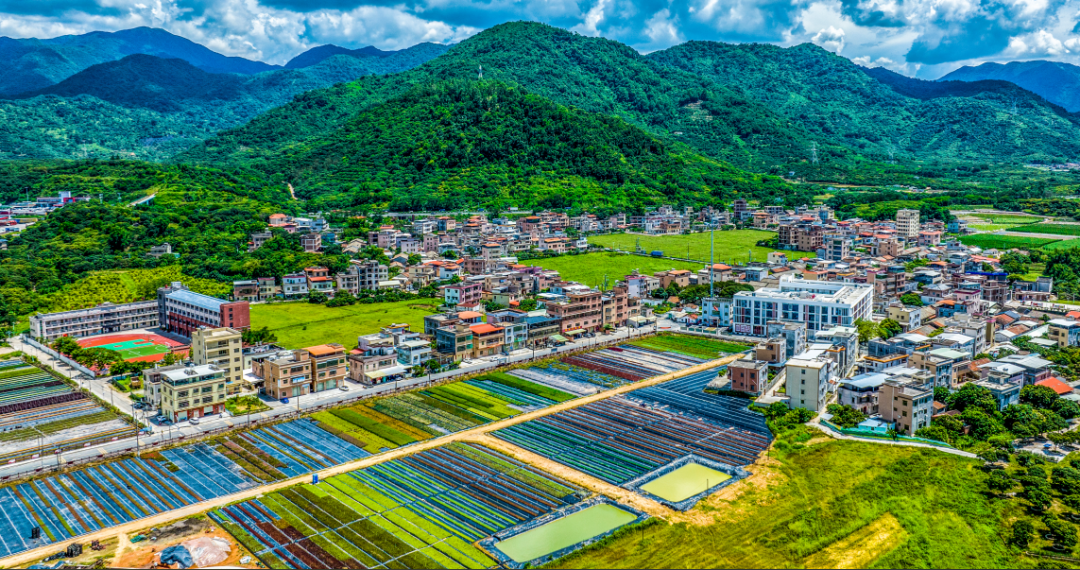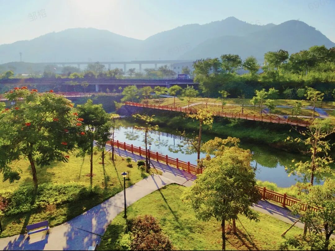 沿着君子营村路前行,红黄蓝三色彩虹路蜿蜒在田野乡间,白墙黛瓦的美丽庭院与连绵起伏的荔枝林相映成趣。