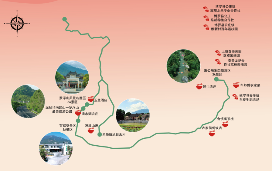 龙华镇旭日古村—途径环南昆山—罗浮山最美旅游公路—罗浮山风景名胜区(国家5A级旅游景区)—客家婆景区(国家3A级旅游景区)—荔枝果园—雷公峡生态旅游区(国家3A级旅游景区)