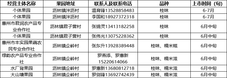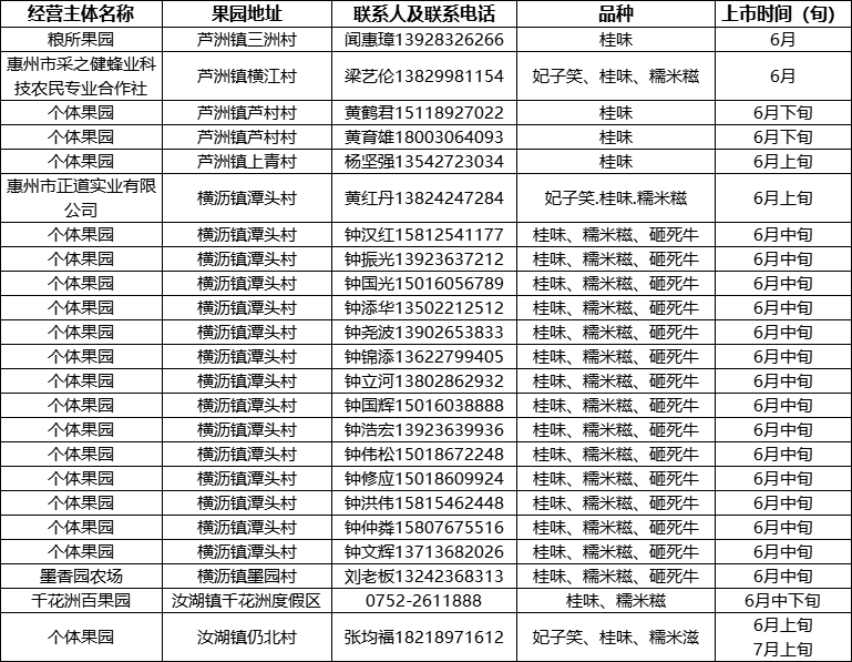 惠州市丰实园果蔬农民专业合作社、惠州市君润农产品专业合作社、绿韵农产品专业合作社、水厂背果园、大山塘果园、个体果园等