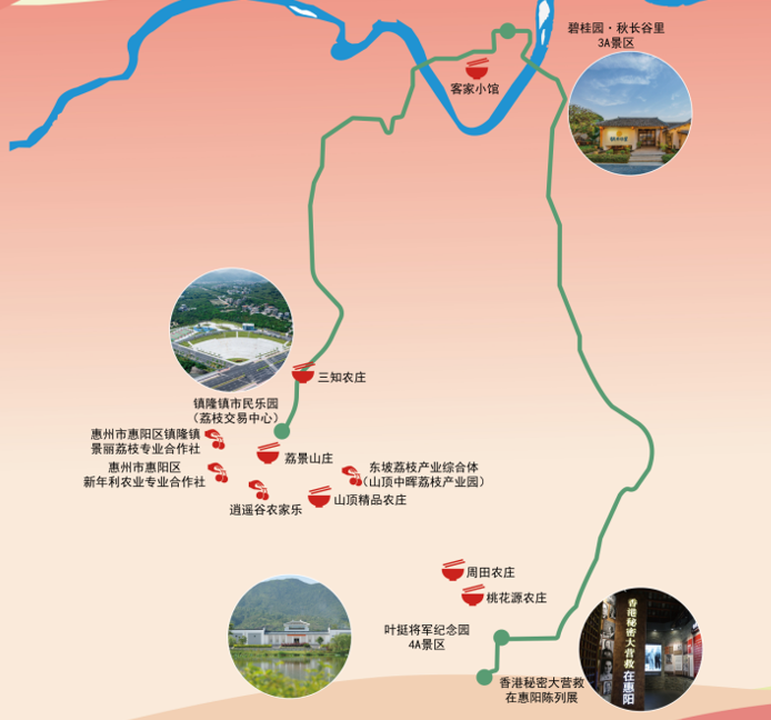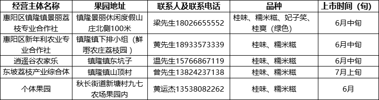 惠州市惠阳区镇隆镇景丽荔枝专业合作社、惠州市惠阳区新年利农业专业合作社、东坡荔枝产业综合体(山顶中晖荔枝产业园)、逍遥谷农家乐、个体果园等