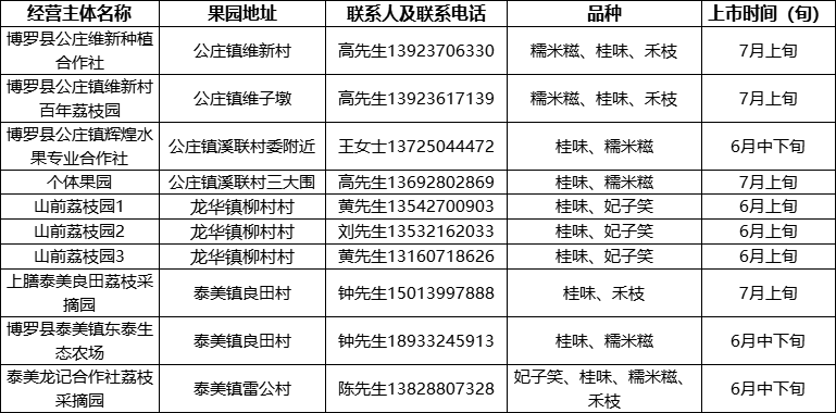 上膳泰美良田荔枝采摘园、泰美龙记合作社荔枝采摘园、博罗县泰美镇东泰生态农场、博罗县公庄镇维新村百年荔枝园、博罗县公庄维新种植合作社、博罗县公庄镇辉煌水果专业合作社、个体果园等