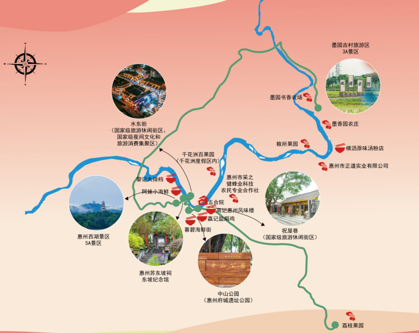墨园古村旅游区(国家3A级旅游景区)—荔枝果园—惠州苏东坡祠、东坡纪念馆—水东街(国家级旅游休闲街区、国家级夜间文化和旅游消费集聚区)—中山公园(惠州府城遗址公园)—惠州西湖景区(国家5A级旅游景区)—祝屋巷(国家级旅游休闲街区)