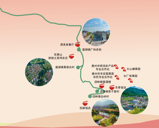 三家湖牛肉店、九龙峰御龟园、神仙山窑鸡山庄、平记牛庄、“冇油开声” 肠粉店、梅花源山庄、其记农家饭店、鸿记饭店、滑记海鲜饭店、巽寮印象美食部落等