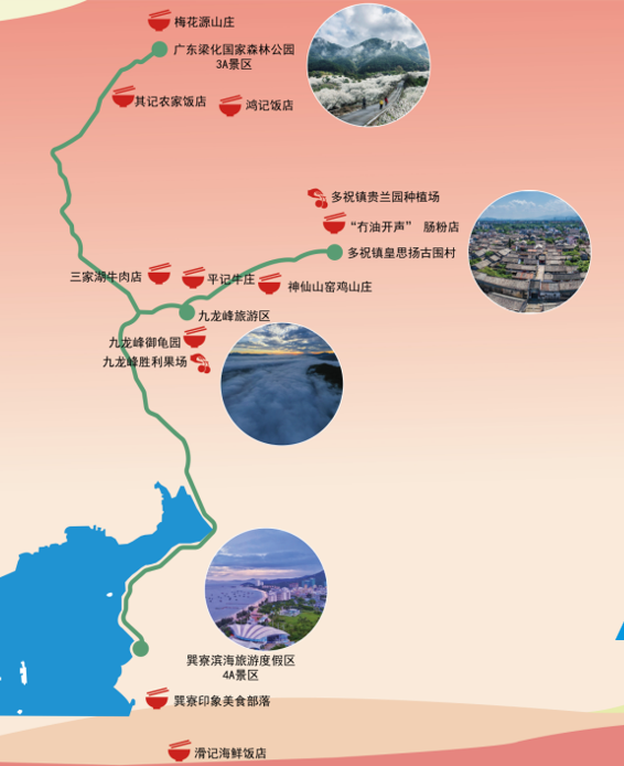 广东梁化国家森林公园(国家3A级旅游景区)—多祝镇皇思扬古围村—荔枝果园—九龙峰旅游区—巽寮滨海旅游度假区(国家4A级旅游景区、省级旅游度假区)