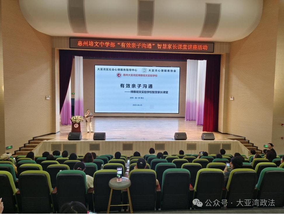 近日,区社会心理服务指导中心联合博雅培文实验学校、区心理服务协会在校内燕园剧院举办了“有效亲子沟通”智慧家长课堂讲座。本次讲座由广东省心理咨询师协会执行会长施一昕担任主讲老师,通过真实案例剖析、互动问答等形式,深入浅出地传授亲子沟通技巧,帮助家长打破代际隔阂,用科学方法助力孩子心理健康成长。