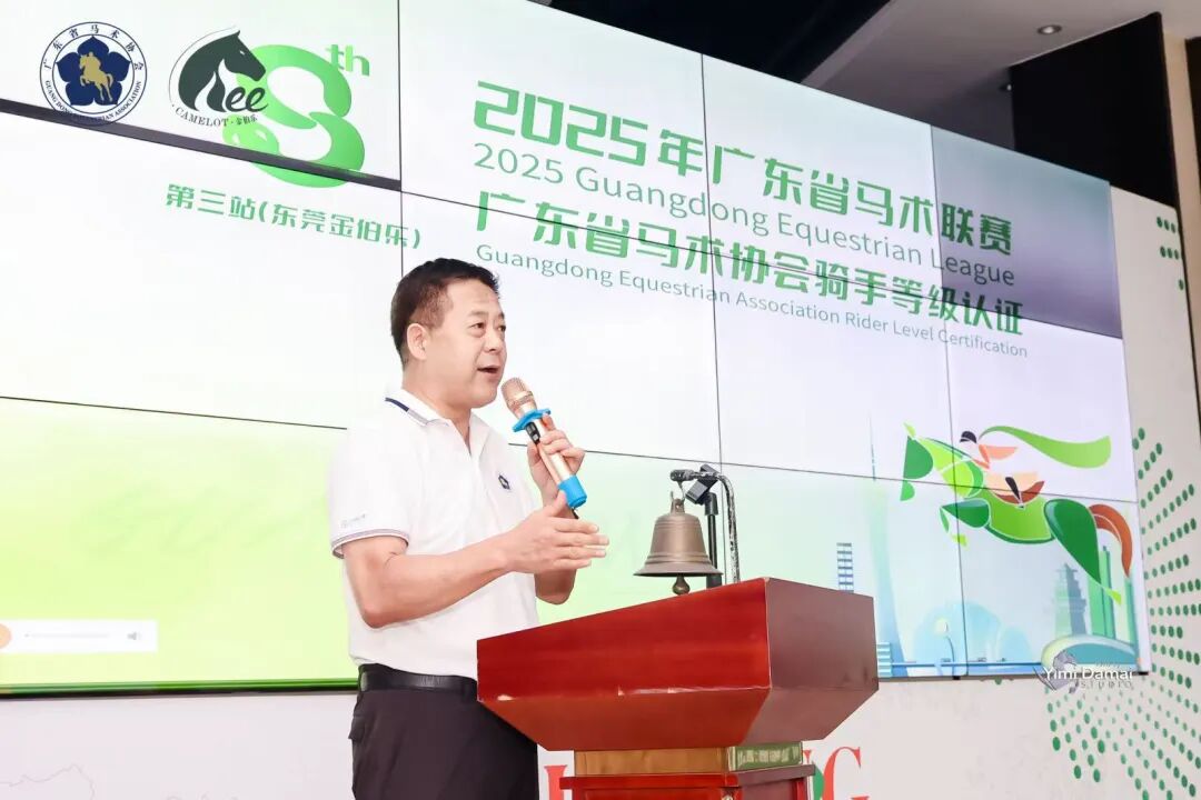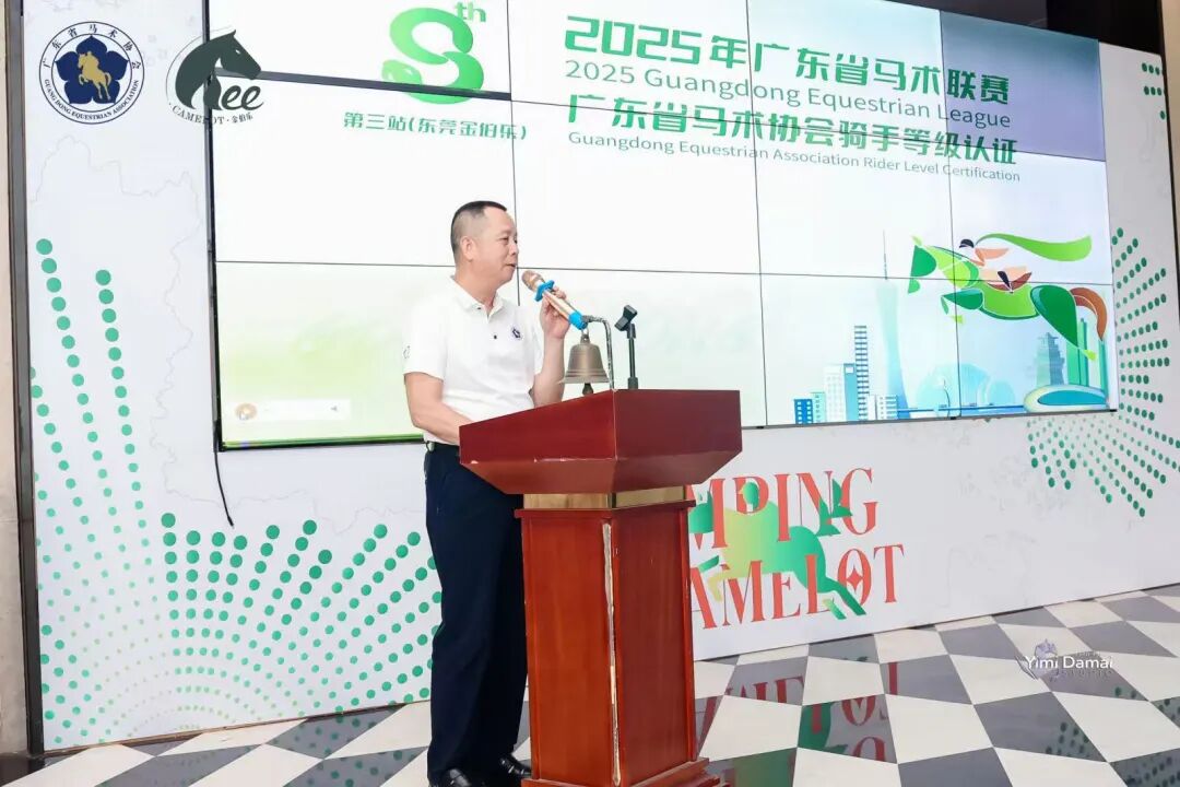 陈广新在开赛仪式上致辞。他表示,广东省马术联赛自2017年创办以来,已经走过了八个年头,从最初的四站赛事发展到如今的年度十站联赛和八站U系列赛,见证了广东马术从起步到逐渐壮大的全过程。本次比赛的人马组合参赛数更是达到了430对,创下历年联赛单项场地障碍参赛人数之最。