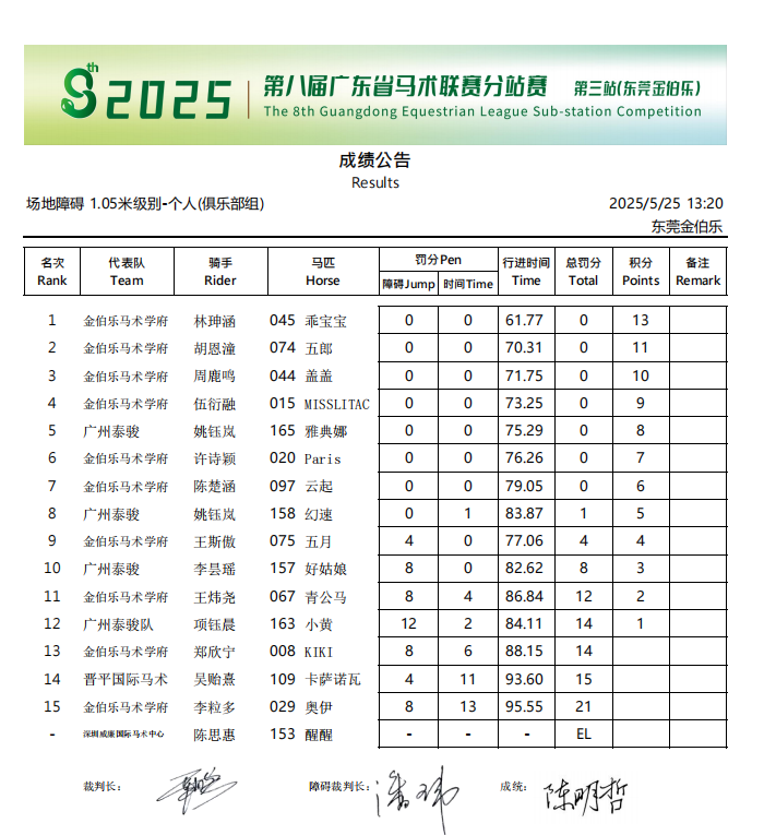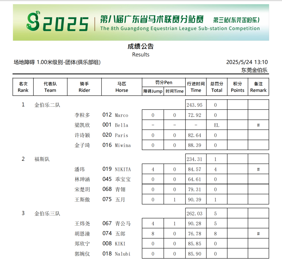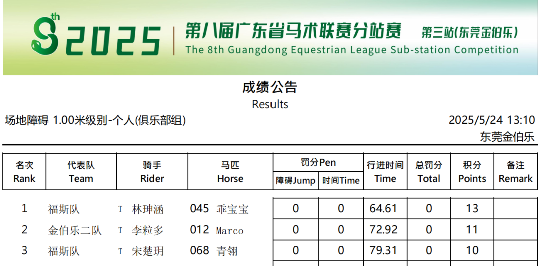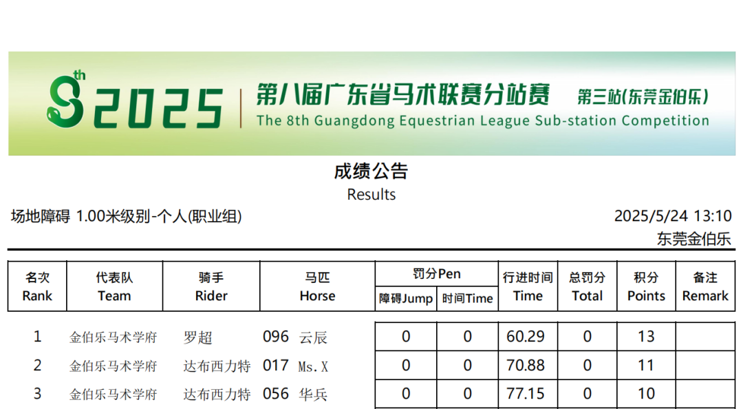 随后进行的1.00米级别比赛同样精彩纷呈。金伯乐马术学府的骑手包揽了该级别的前三名,具体获奖成绩如下: