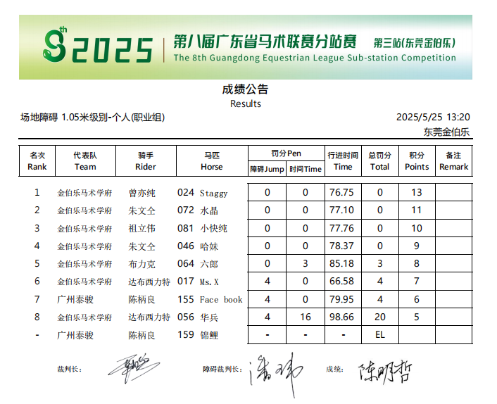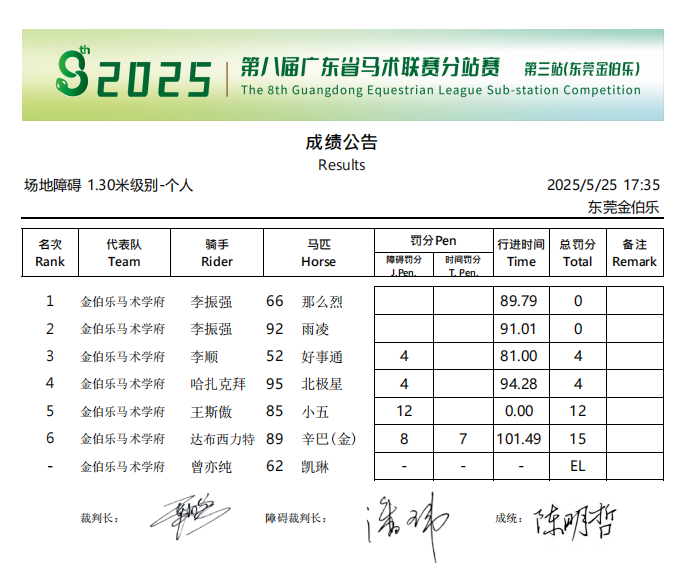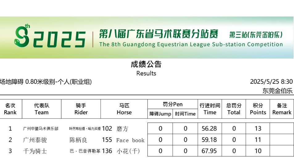 随着 1.30 米级别比赛的结束,2025 年第八届广东省马术联赛分站赛第三站赛事也圆满落下帷幕。430 对人马组合在赛场上为观众呈献出一场精彩绝伦的场地障碍表演,每一次的精彩跳跃都如同广东马术运动的发展一样,不断突破,不断前行。