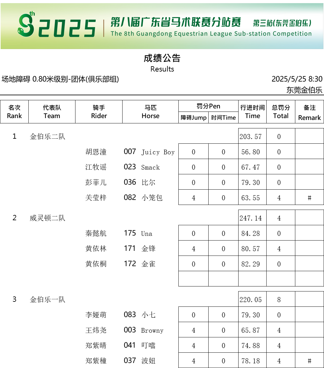 在0.80米级别比赛中,金伯乐二队的胡恩潼、江牧谣、彭菲儿、关莹梓四位骑手携手出战,凭借默契的团队配合,一举摘得0.80米级别俱乐部组团体金牌。而由李娅萌、王炜尧、郑紫晴、郑紫穜四位骑手组成的金伯乐一队也不甘示弱,获得了铜牌。威灵顿二队的黄依林、黄依桐、秦懿航三位骑手继首日比赛摘得 0.6 米级别团体金牌后,再获0.8米级别团体银牌,展现了他们的强劲实力。