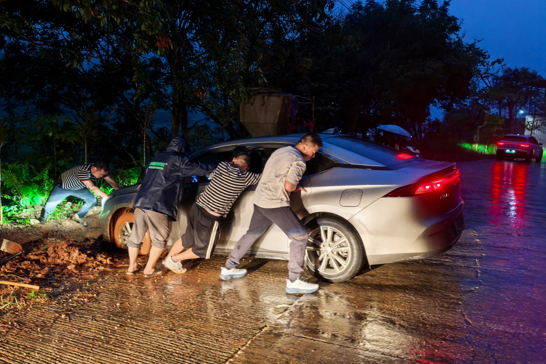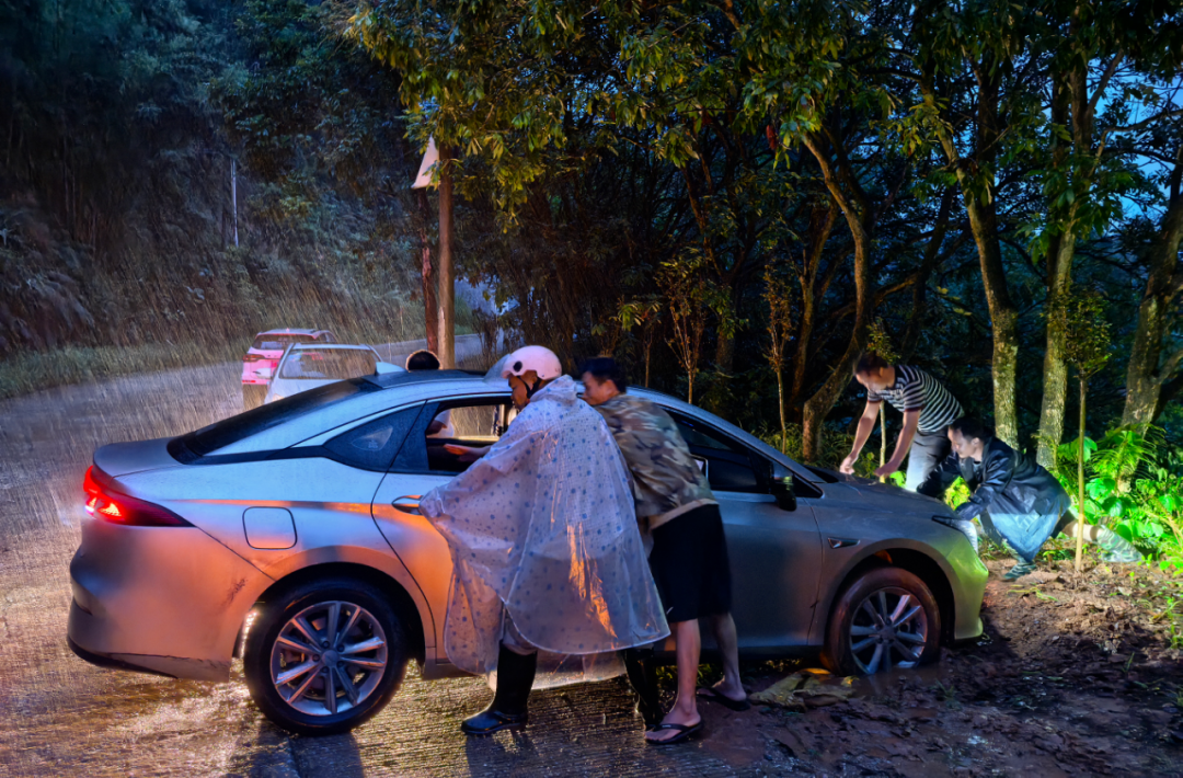 没过多久,两个村的党员干部陆续到位,现场的力量从2人增加到7人,还有开车经过的奇峰农业发展有限公司的2位负责人,9人“临时救援小队”组成!大家喊着口号一起发力推车,没想到尝试了好几遍也推不出来。由于车轮不停转动翻泥,泥坑已经变得很深,得换个方案,“用我们的车拉出来吧!”奇峰农业的负责人从车上拿出拖绳,把公司的车和陷泥车辆绑在了一起。现场有的帮忙指挥2台车调整方向,有的留意过往车辆做好警戒。“好!出来啦!出来啦!”陷泥车辆终于得到“解救”,现场一片欢呼。汪先生不停地向大家表示感谢,“还好有你们,真的是帮了一个大忙!我自己试了好久开不出来,雨又越下越大,还好你们来了,我心就定了,谢谢当地党员干部和热心群众!”