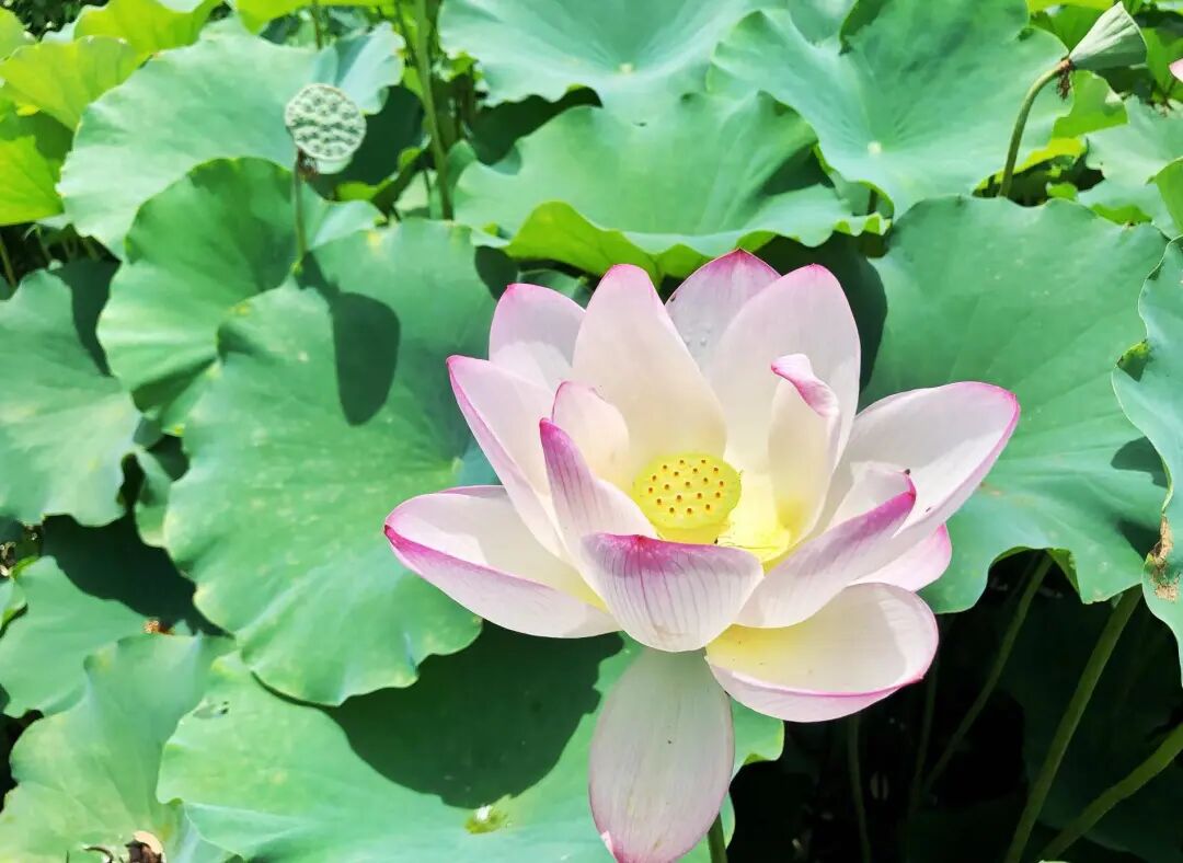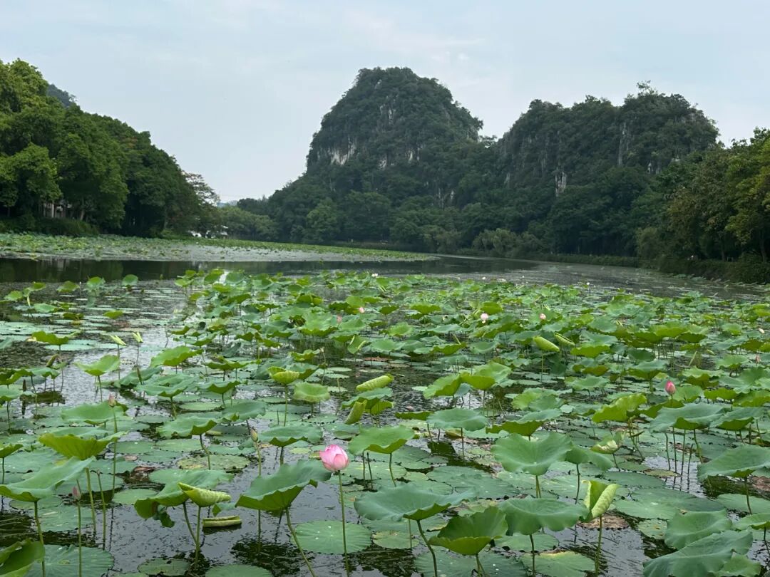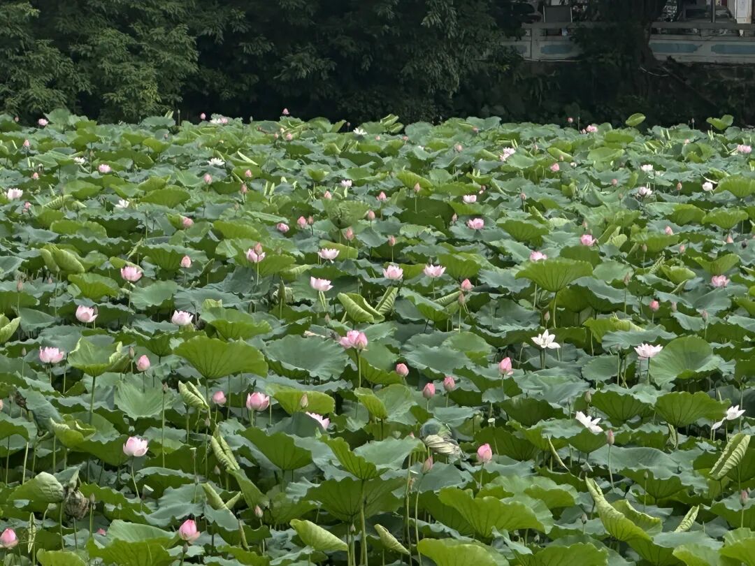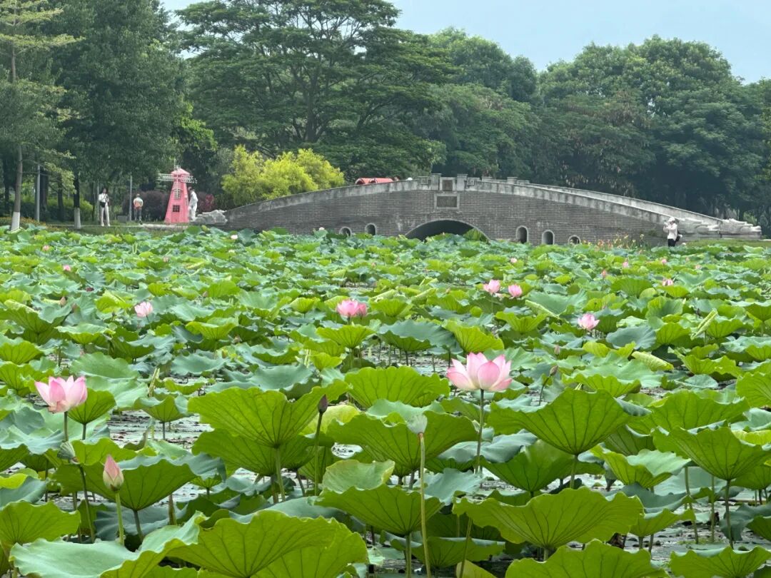 七星岩景区红莲桥附近的荷花同样美不胜收。饱满的花骨朵已透露出粉色,含苞待放;盛放的荷花在荷叶间肆意舒展,楚楚动人。微风轻拂湖面,荷花与荷叶轻颤摇曳,随风舞动。
