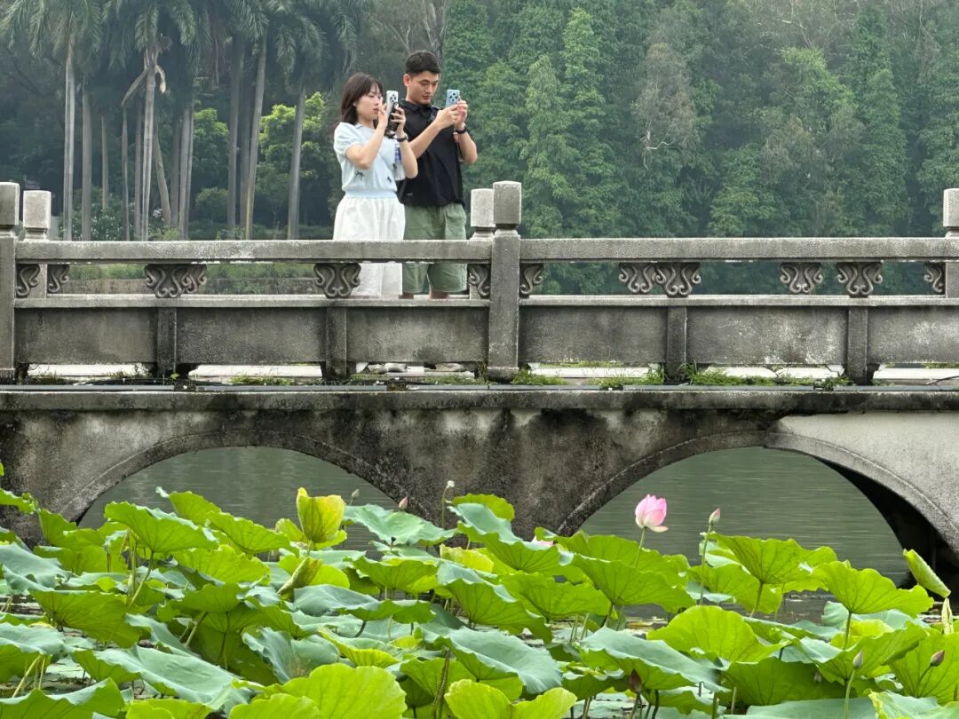 在七星岩景区红莲桥附近,市民游客在欣赏荷花。