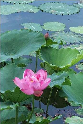 近期雨水频繁,阵雨过后的牌坊公园荷塘别有一番风味。荷花上带着晶莹剔透的水珠,点缀在连片的碧叶之间。荷花姿态各异,有的全部盛放,有的还是花骨朵;有的傲然屹立枝头,一枝独秀,有的则藏于荷叶背后,犹抱琵琶半遮面,娇艳欲滴,让置身其间的市民游客心旷神怡。
