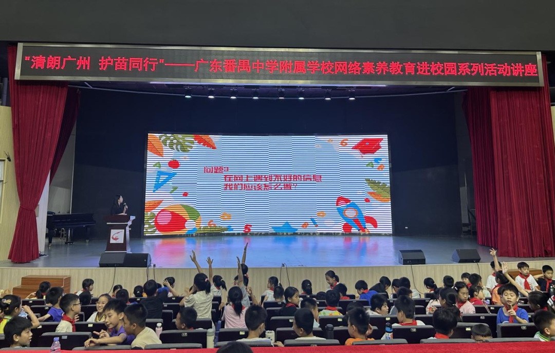 5月29日,广州番禺中学附属学校报告厅内,区委网信办为四年级学生打造了一堂趣味的“网络安全启蒙必修课”。