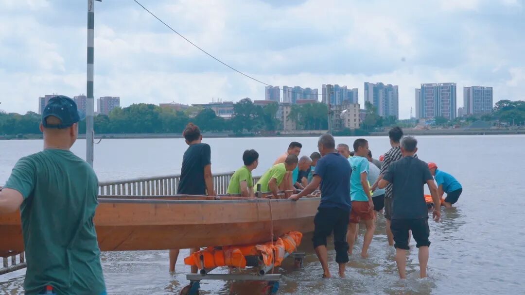 起龙后,经过晾晒、重新抹上桐油灰、上过油漆的龙舟迎来了“进水”仪式。穗石村村民们将龙舟从龙船坞缓缓推进水中,象征着龙舟正式回归水域,准备迎接接下来的端午活动。