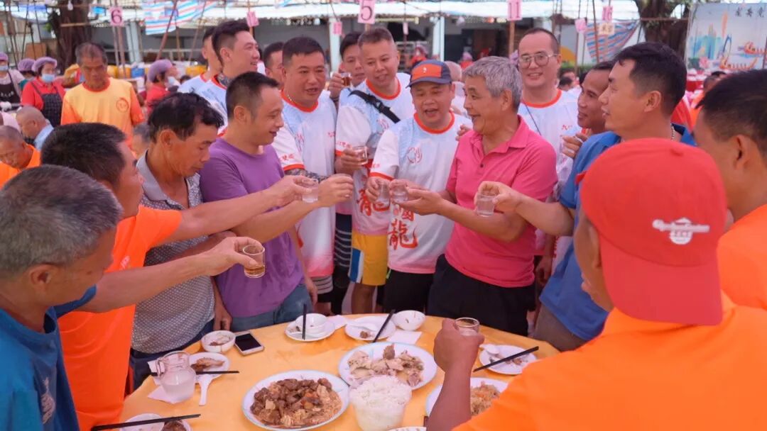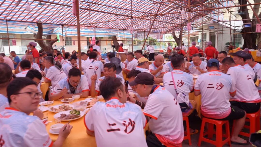 远道而来的扒仔们吃罢点心稍作休整,很快又被盛情邀请入席品尝这最具端午特色的龙船饭。龙船饭是端午节期间的重要环节,它不仅是对划手们的犒劳,更是全村人团圆的象征。