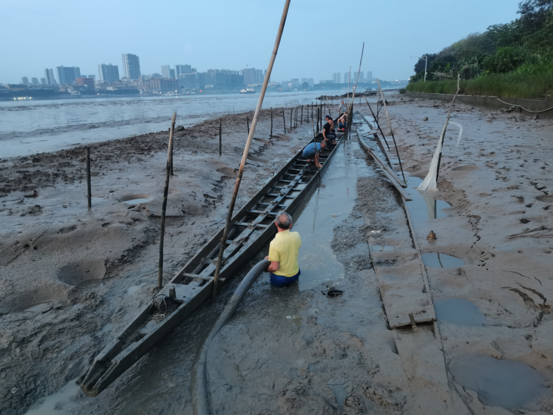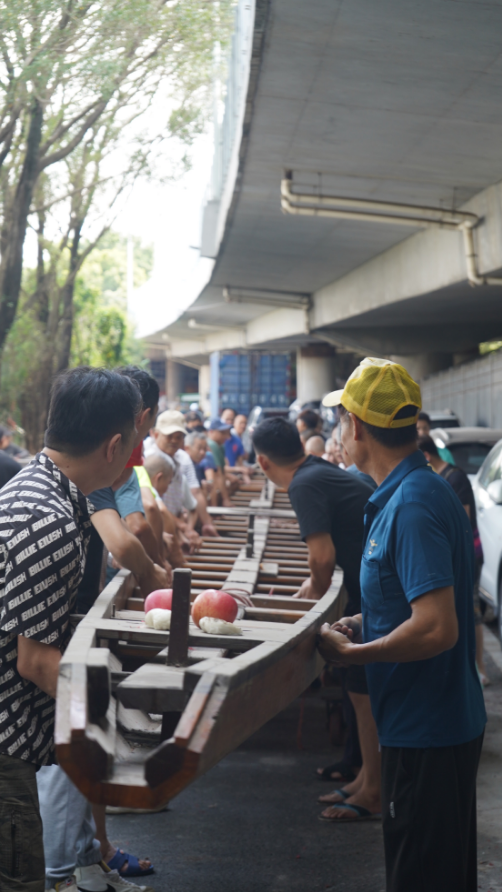 “‘龙舟沉塘’是番禺特有的智慧。”林叔介绍,每年端午后,各村陆续开始藏龙仪式,即把龙舟沉入特制的“龙船坞”,用富含微生物的淤泥包裹船体以防腐。这种独特的保存方式不仅保护了龙舟,更赋予了它一种神秘的仪式感。而龙头、龙尾则供奉在祠堂里。村民们相信,沉入淤泥的龙舟将在来年再次“苏醒”,继续传承这份古老的文化。