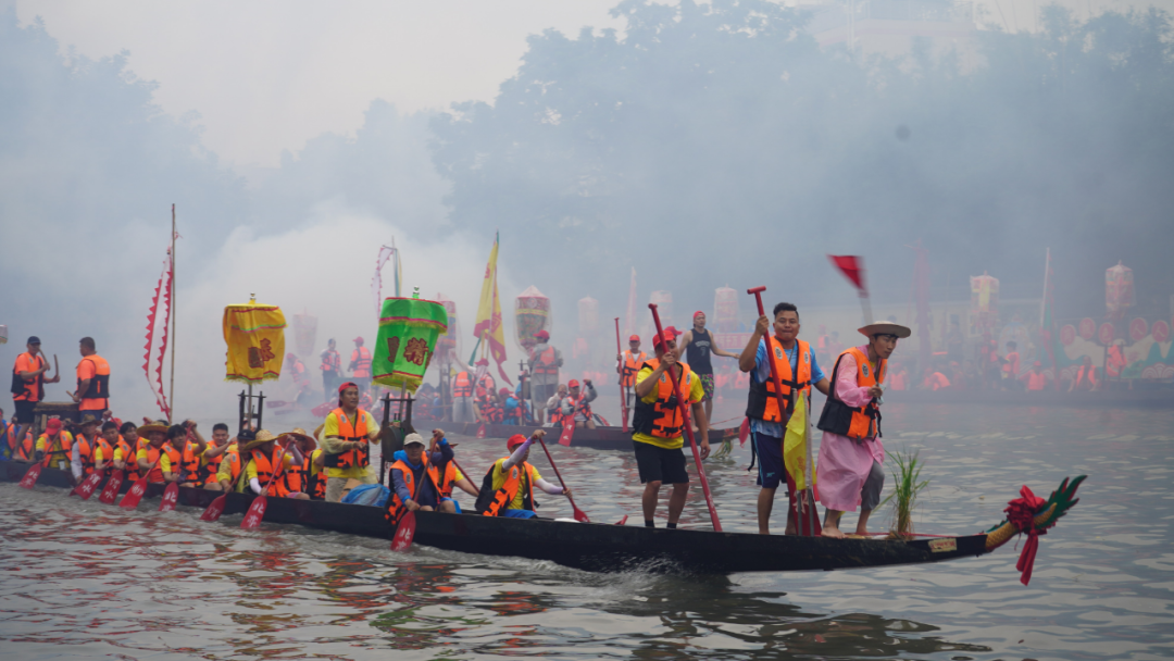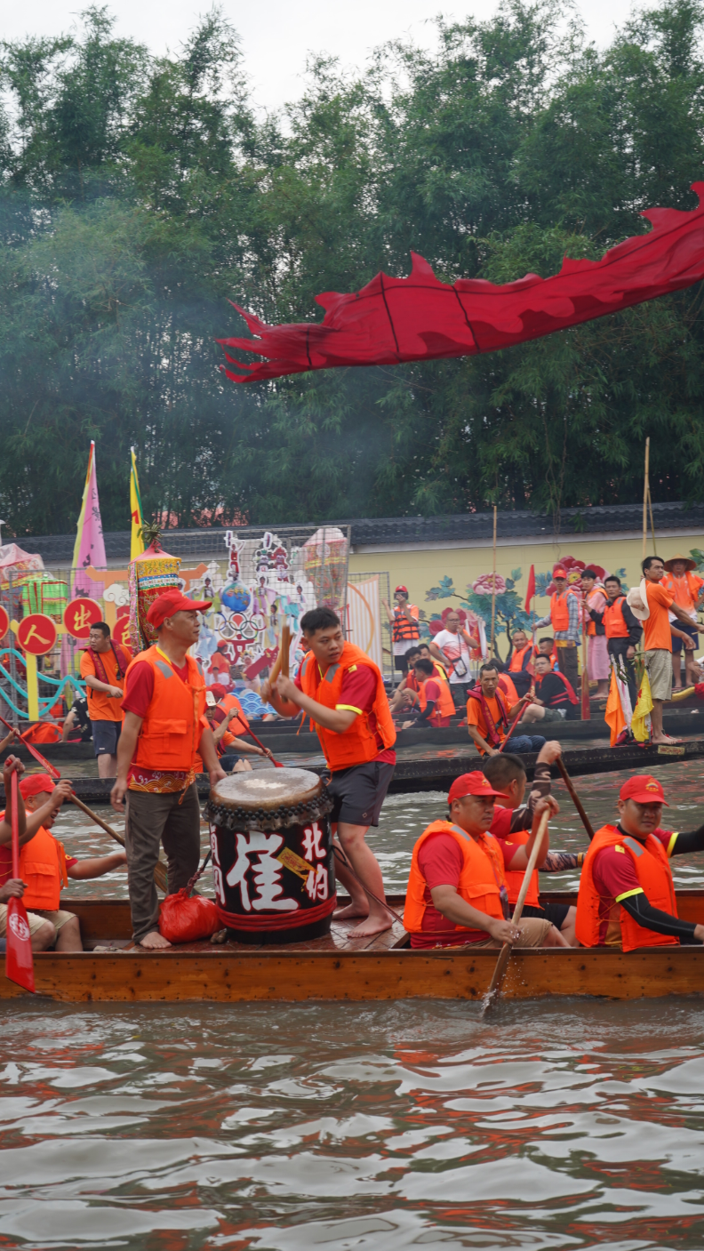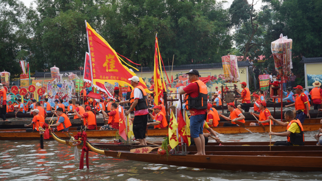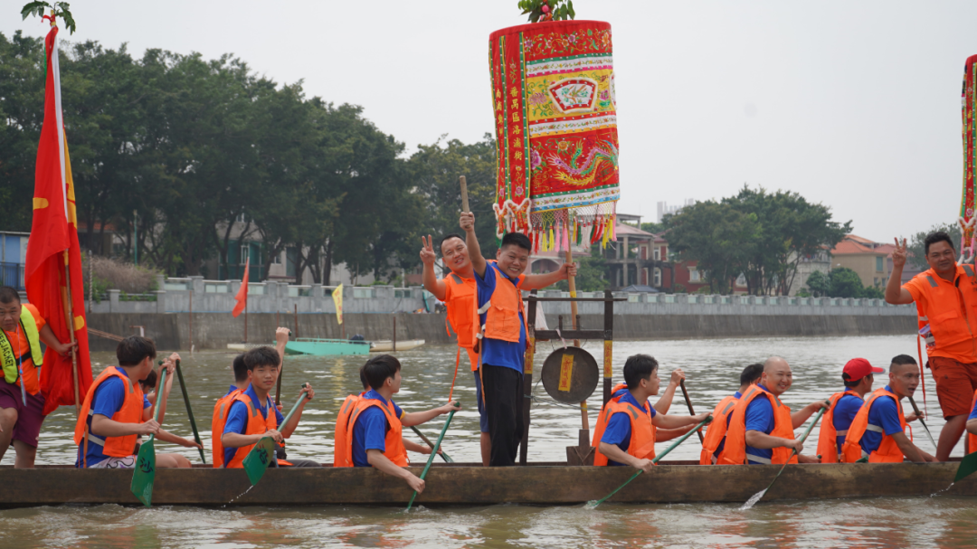 本村和兄弟村的龙船并驾齐驱、来回游弋。按照习俗,每条龙舟都要谨守“三个来回”的规矩,在平静的水面上奋力划桨,激起层层浪花,好似游龙出海。待到下午时分,兄弟老表村的龙船方才“回龙”,又是三个来回,以示对东道主盛情款待的谢意。