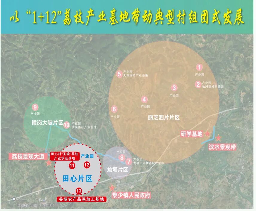 罗定市黎少镇深挖百年荔枝种植底蕴,以“品种调优、品质提档、品牌创建”为核心,创新构建“1+12”现代荔枝产业园发展体系。其中,田心村“圣糯”荔枝产业示范基地运用“政银企村户”模式,统筹推进引入央企战略合作、深化产业体系构建等,实现“种植技术革新、产业链条拓展、联农带农机制创新”三重突破,为“百千万工程”注入持续发展动能。