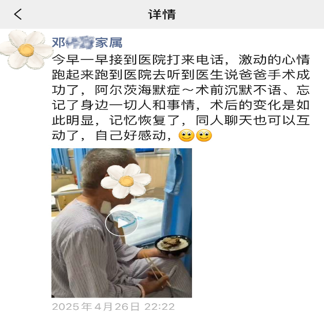 术后当晚,邓阿叔即有明显改善,能认识家人,和其他亲属视频时也能叫出名字,能与人聊天互动,且效果持续改善,一周后在门诊随访,邓阿叔精神面貌良好,可以自然沟通交流。