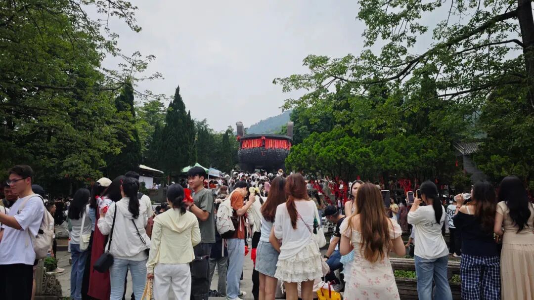 在鼎湖山同样非常热闹。游客们来鼎湖山必打卡项目——九龙宝鼎,无论是本地游客还是外地游客纷纷向宝鼎投掷许愿球许下美好的愿望。游客行至落数十米的飞水潭瀑布前,只见白练悬空,飞珠溅玉,磅礴气势令人震撼。