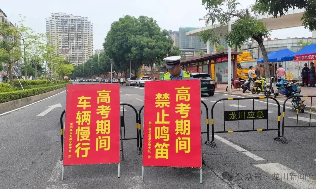 一大早,龙川交警在各个考点周边重点路段设立交通管制区域,竖立醒目警示牌,实施临时交通管制措施。