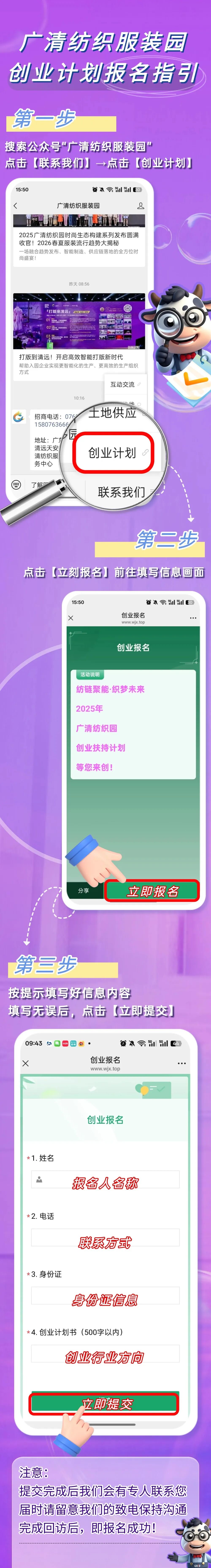 ·招募对象:招募方向涵盖服装设计、样衣制版、加工生产、电商销售等与纺织服装相关的产业链上下游环节;愿意长期扎根广清纺织园的初创团队和成长企业。